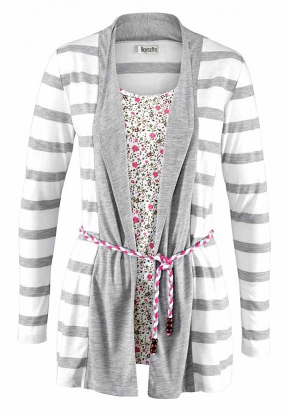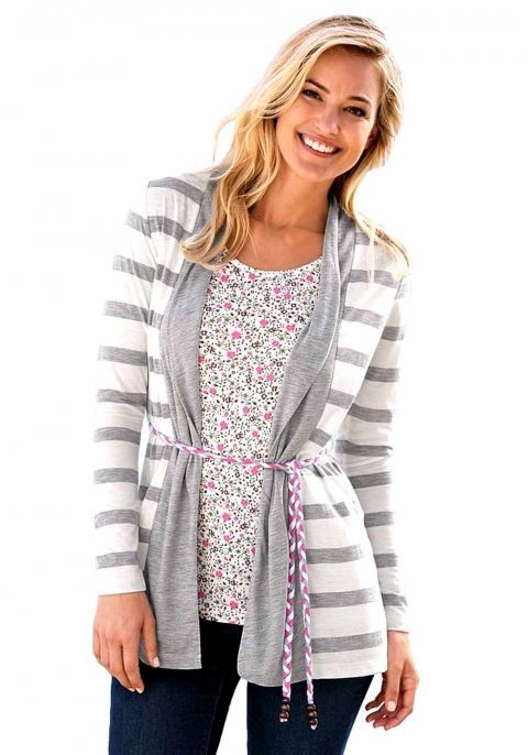 Hier präsentiert sich der 2-in1-Style de luxe. Trendstarkes Edel-Basic in Jacken-Top-Optik inklusive Flechtbindegürtel mit Holzperlen. Garngefärbte Streifen für dauerhaft intensive Farben. Schalkragen in weicher Faltenlegung. Integriertes Top mit floralem Alloverdruck. Länge ca. 76 cm. Figurbetonende Form. Jerseyware aus 67% Viskose/33% Polyester. Einsatz aus 100% Viskose.