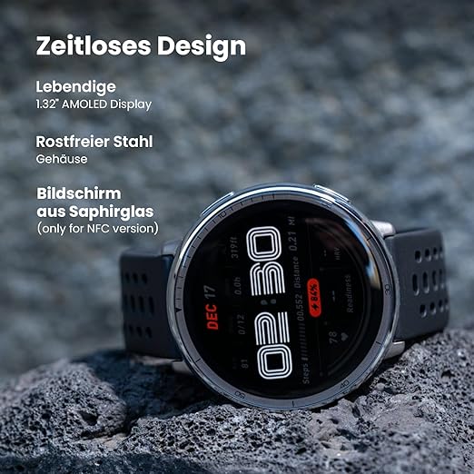- Robust & alltagstauglich: 5 ATM Wasserschutz, AMOLED-Display mit sehr guter Ablesbarkeit.