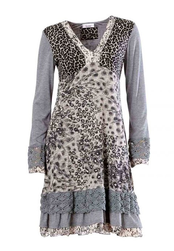 Designer-Chic mit magischer Wirkung. Prachtvolle Kreation in elegantem Patchwork-Design. Ein echter Hingucker mit effektvoll gepatchten Leo-Prints und Uni-Stoffen. Langer Arm und Saum mit Häkelspitze besetzt. Mehrlagiger Volantabschluß. Figurbetonte Silhouette mit ausschwingender Saumweite. Länge ca. 98 cm. Trageangenehmer Jersey aus 90% Viskose/10% Elasthan. Häkelbordüre aus 60% Baumwolle/40% Polyacryl.