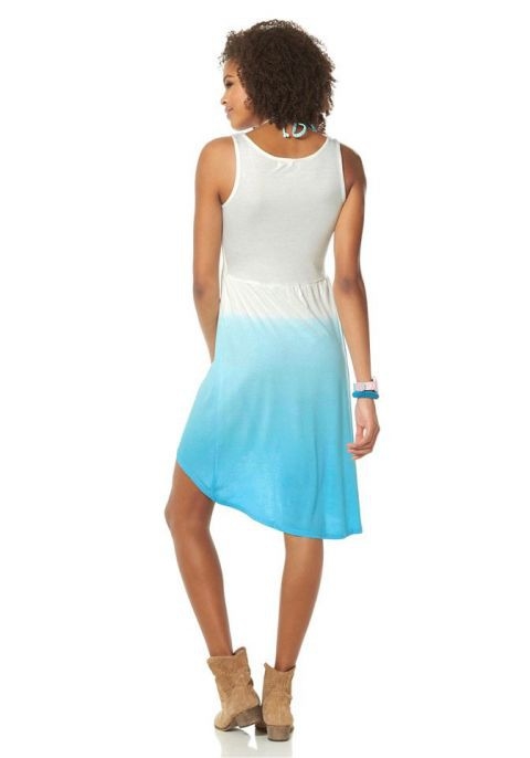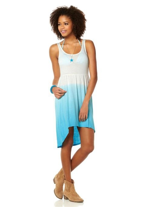 Produktbeschreibung Trendy Kleid, hinten länger geschnitten als vorne und mit modischem Batikverlauf. Breite Träger. Figurbetonte Form. Gesamtlänge vorn ca. 80 cm, hinten ca.100 cm. Sommerleichtes Material aus 100% Viskose. Ohne abgebildeten Schal.
