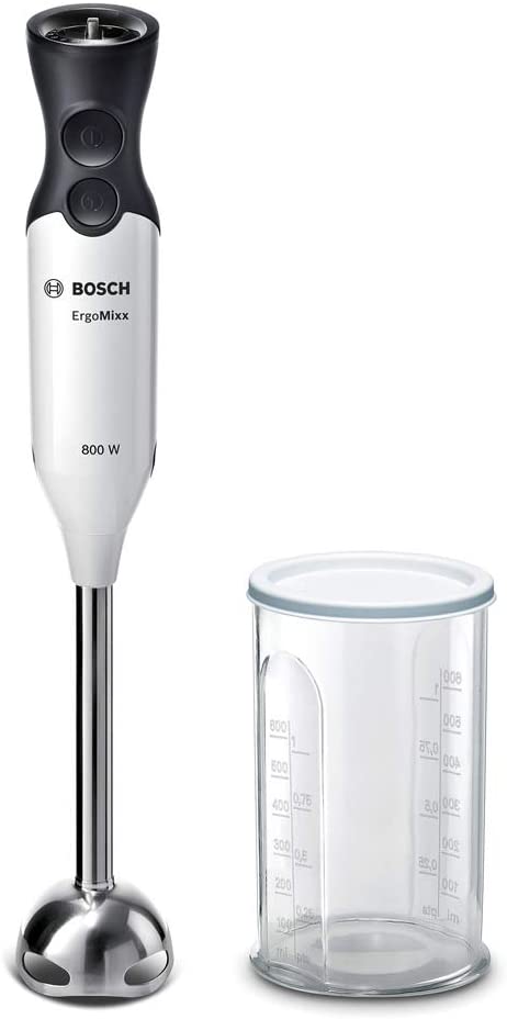 Bosch ErgoMixx MS61A4110. Schüsselkapazität: 0,6 l, Control Typ: Drehregler. Typ: Pürierstab, Produktfarbe: Weiß. Leistung: 800 W, Energiequelle: AC, AC input voltage: 220 - 240 V. Breite: 55 mm, Tiefe: 62 mm, Höhe: 393 mm