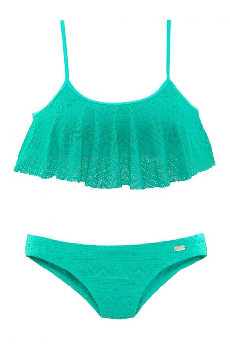Ein Strand-Highlight der Extraklasse von Buffalo. Rundum femininer Bikini mit Blickfang-Faktor und stilvollen Details. Effektvolles Top mit modischem, gerüschtem Besatz aus Strukturware in toller Spitzen-Optik. Sehr praktisch - herausnehmbare Softcups und verstellbare Träger.