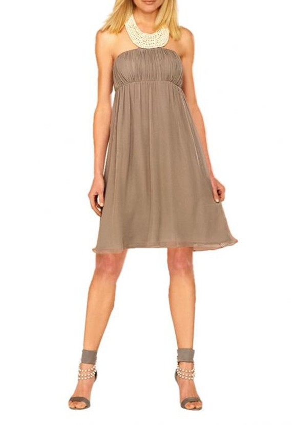 Ein unwiderstehliches Highlight der Abendmode. Diese Kreation macht seine Trägerin zum glänzenden Mittelpunkt des Geschehens. Elegant in Szene gesetzter Babydoll-Style mit avantgardistischen Akzenten. Raffiniert ausgearbeitete, elegant drapierte Brustpartie und drapierte Rückendekolletékante. Die eingearbeiteten Schalencus zaubern ein hinreißendes Dekolleté und erübrigen das Tragen eines BHs. Eyecatcher ist die kapriziös geschwungene Halsblende mit aufgestickten Perlen. Haken-Ösen-Verschluß im Nacken. Figurbetonte Silhouette mit weit ausschwingendem Saum. Länge ca. 94 cm. Chiffon und Satinfutter aus 100% Polyester. Nahtfeiner, seitlicher Reißverschluß.