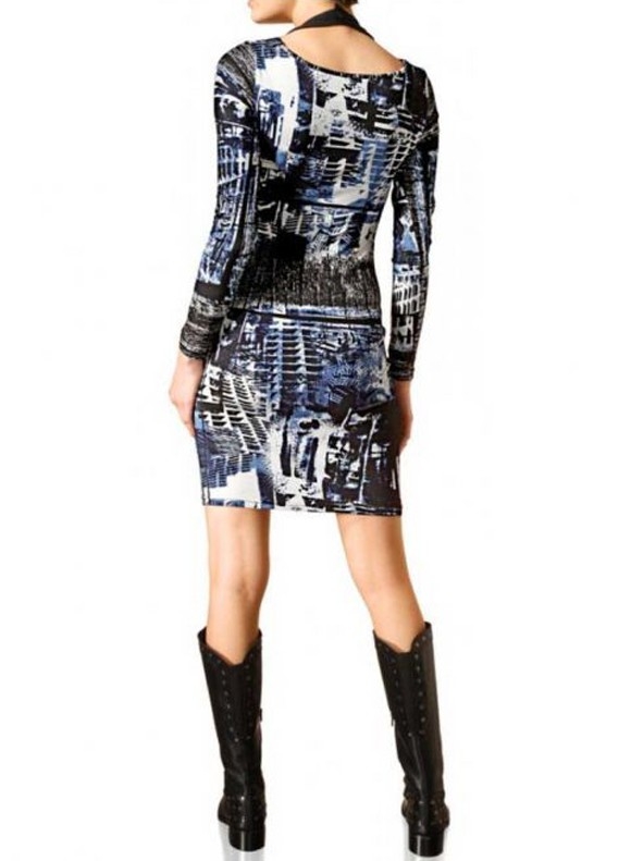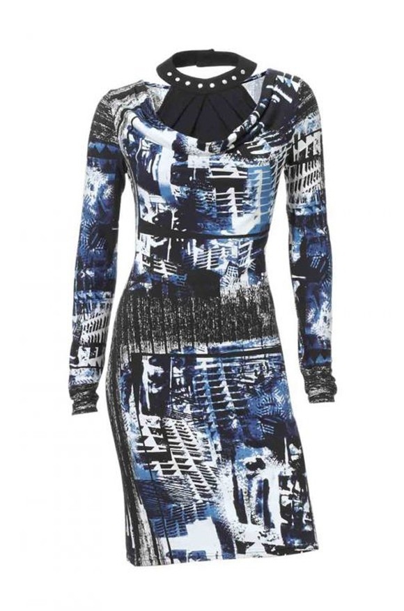 Repräsentativ auf der ganzen Linie. Individuell designtes Kleid. Umwerfend attraktiv: der in Falten gelegte schwarze Einsatz mit Nietenbesatz am Wasserfall-Ausschnitt. Nackenverschluß. Moderner Grafik-Print. Länge ca. 90 cm. Figurbetonte Form. Weich fallende, softe Jersey-Qualität aus 96% Viskose/4% Elasthan.
