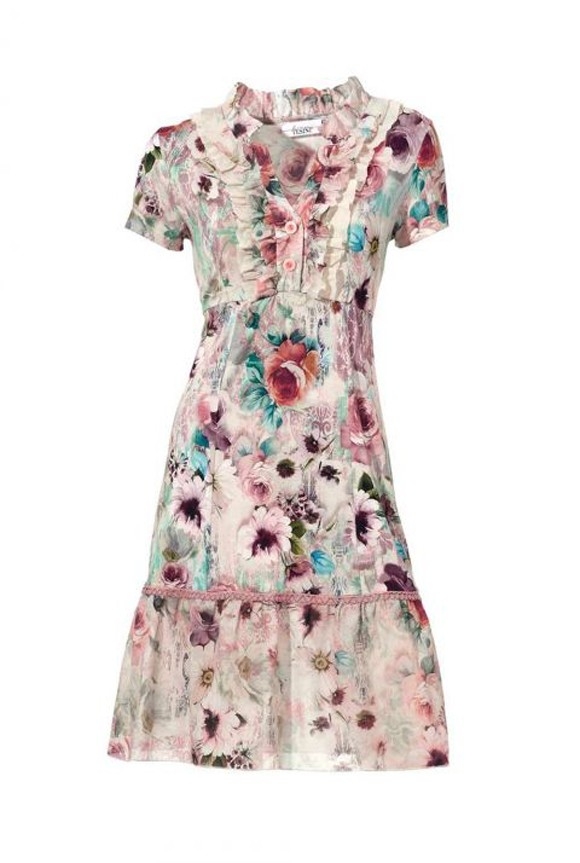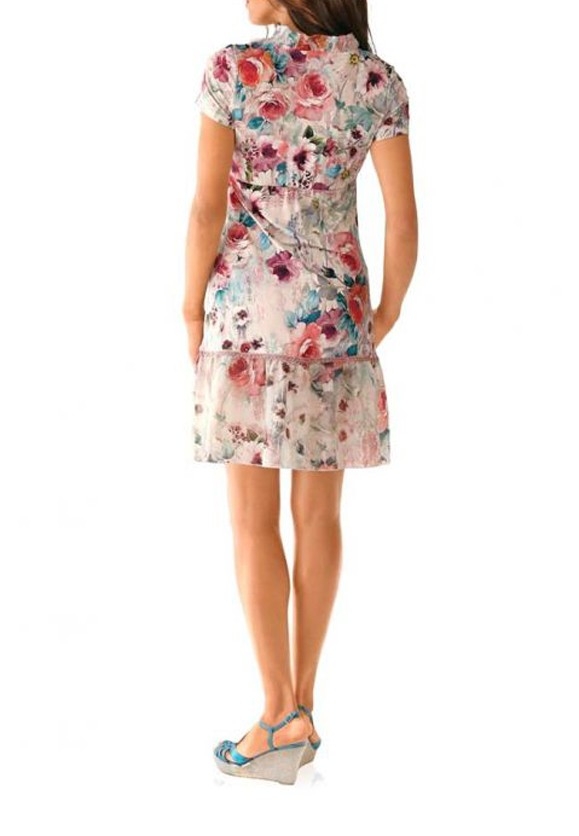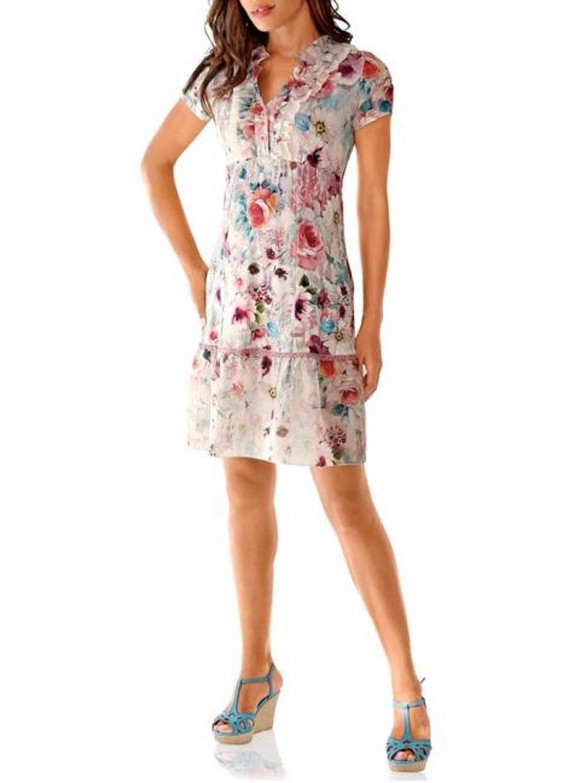 Kreativ und inspirierend. Designstarkes Kleid mit tollem Pastell-Print und faszinierender Farb-Kombination.Leicht taillierte Form mit Unterbrustnaht. Am Ausschnitt mit 2 Knöpfen zu schließen und mit mehrlagigem Volantbesatz. Ausschwingender Rockteil mit Volantabschluß und edlem Spitzenbesatz.. Länge ca. 94 cm. Trageangenehme Jersey-Qualität aus 90% Viskose/10% Elasthan. Volants aus Webware aus 65% Polyester/35% Baumwolle. Spitzenband aus 100% Polyester.