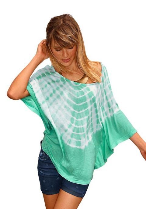 Tolle Farbe starkes Design. Außergewöhnliches Shirt »Lilly« von FUGA. Mit coolen Fledermausärmeln, originellem Batik-Print und tiefem Rundhalsausschnitt. Jedes Teil ein Unikat durch besonderen Batikeffekt. Lässige Passform. Länge ca. 70 cm. Weich fließende Qualität aus 100% Viskose.