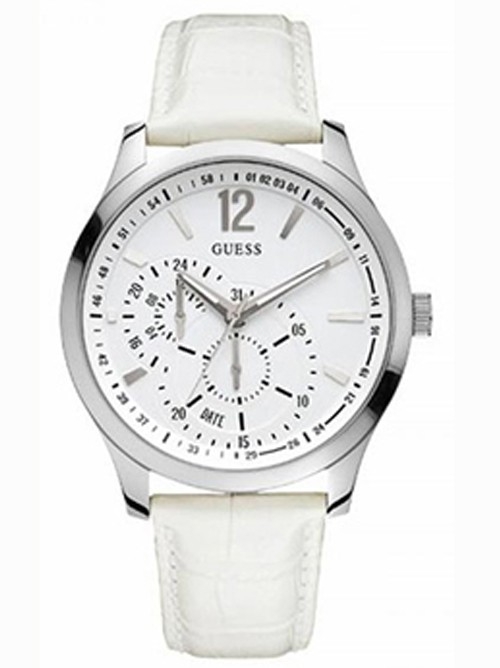 Produktbeschreibung Form des Gehäuses: rundGlas: MineralglasAnzeige: AnalogGehäusematerial: EdelstahlArmbandmaterial: LederArmbandfarbe: weißKalenderfunktion: DatumAusstattung: LeuchtzeigerUhrwerk: QuarzWasserdichtigkeitszertifizierung: 3 Bar