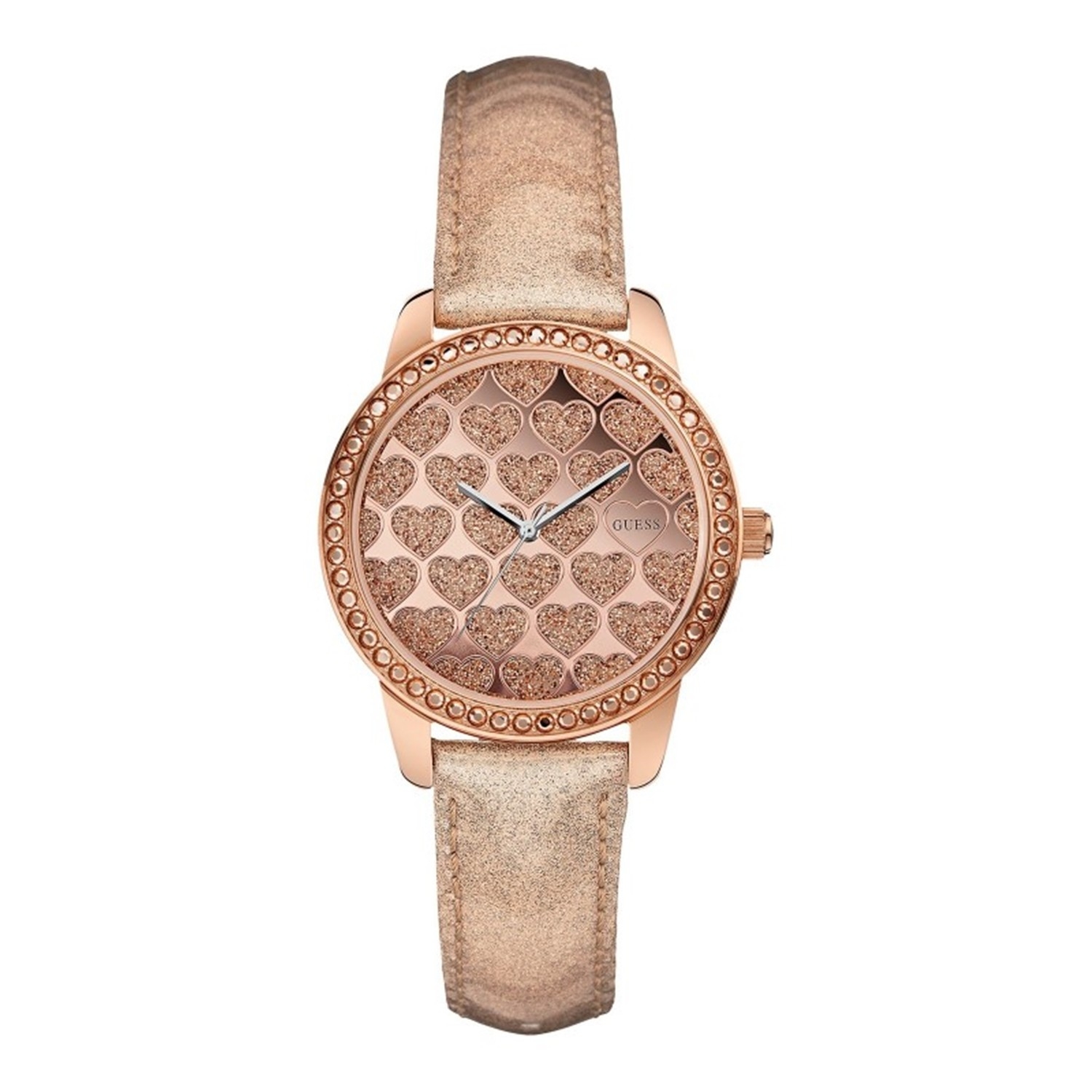 Produktbeschreibung - UVP: 149.00 €- präzises Quarzuhrwerk- kratzfestes Mineralglas- Armband: Leder Rosé-golden- Gehäuse: Edelstahl- Zifferblatt: gemustert- Verschluss: Dornschließe- Wasserdicht: 3 ATM- inkl. Guess Box