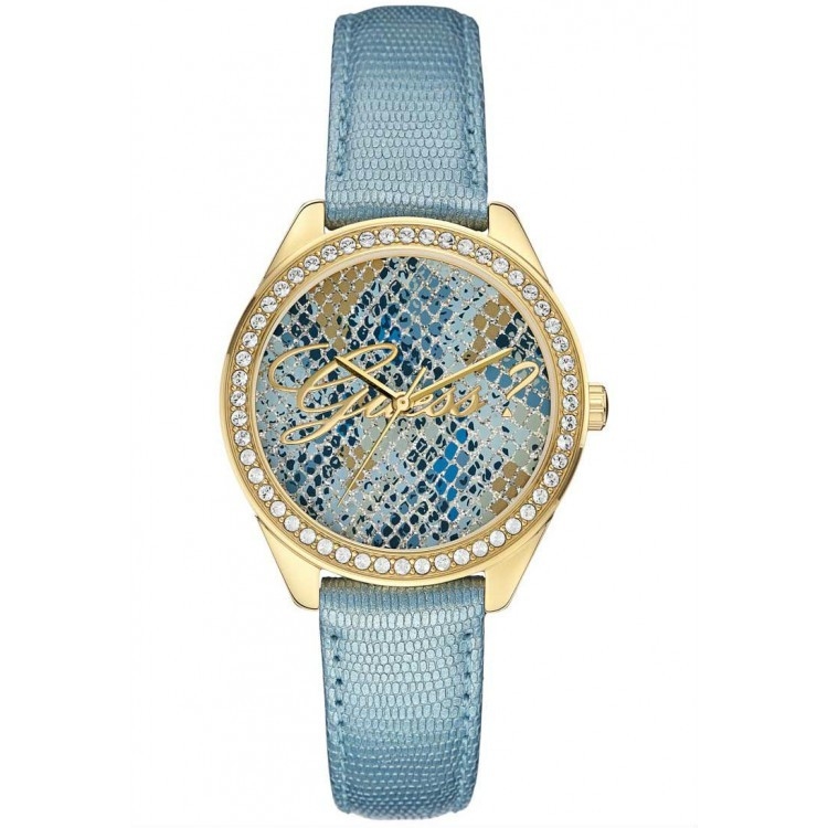 Produktbeschreibung - präzises Quarzuhrwerk- kratzfestes Mineralglas- Armband: Leder Hellblau- Gehäuse: Edelstahl- Zifferblatt: gemustert- Verschluss: Dornschließe- Wasserdicht: 3 ATM- inkl. Guess Box