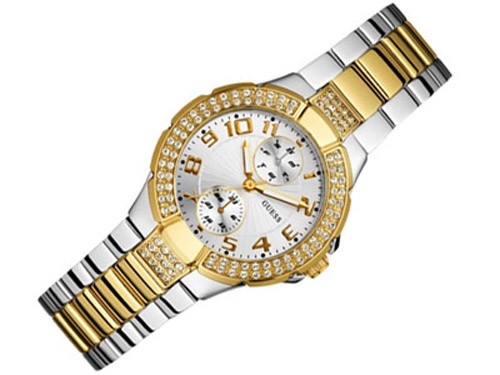 - Edelstahlgehäuse, zweifarbig IP-Gold und poliert, mit Steinen besetzt