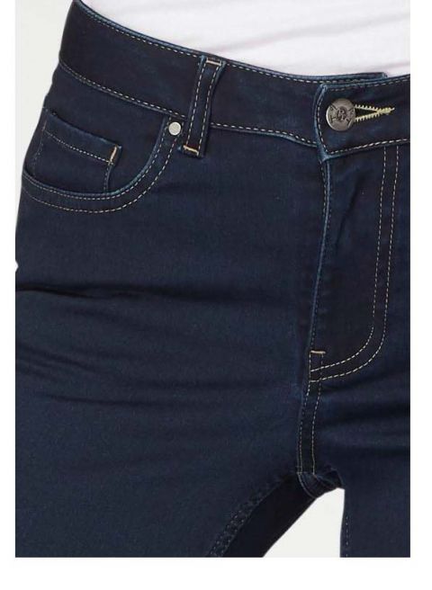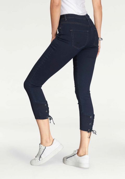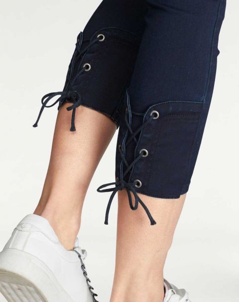Besondere Akzente durch den rückwärtigen Eyecatcher-Besatz mit Metall-Ösen und Schnürung am Saum. Angesetzter, geknöpfter Gürtelschlaufenbund und verdeckter Reißverschluss. Beinschrittlänge ca. 66 cm. Elastische Denim-Qualität aus 78% Baumwolle (unterstützt Cotton made in Africa)/20% Polyester/2% Elasthan.