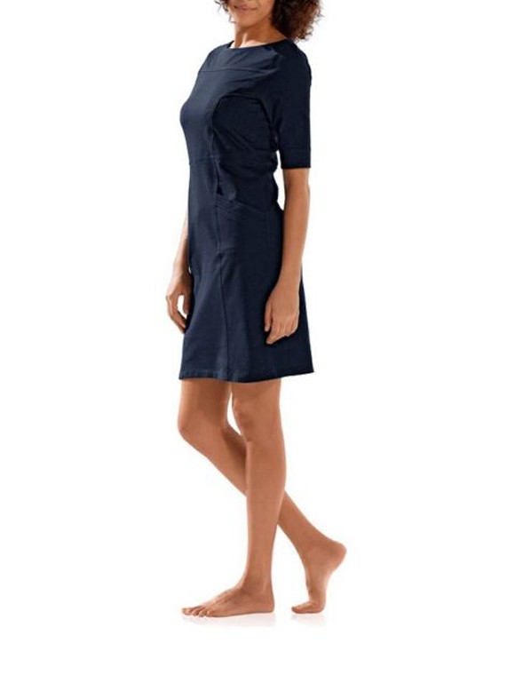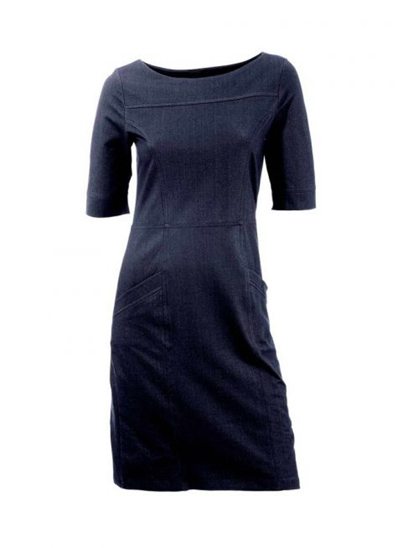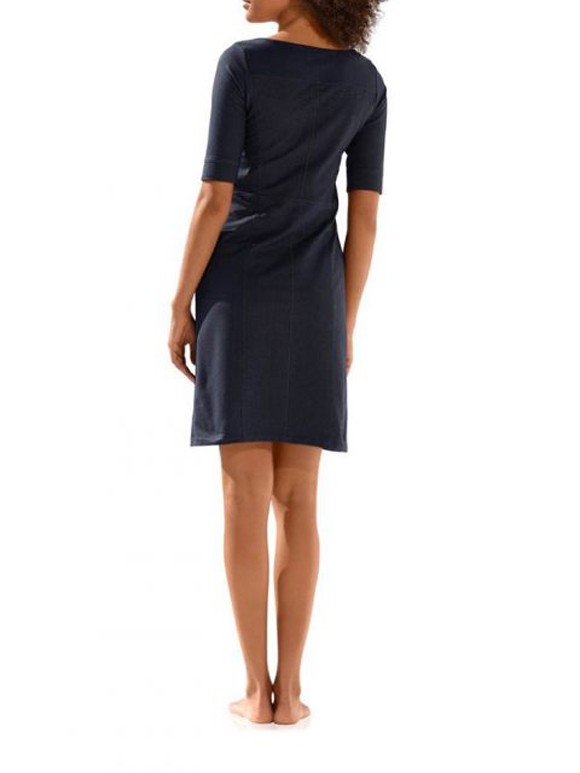Sportiver Luxus ganz am Puls der Zeit. Extravagant in Szene gesetztes Kleid in Etui-Form und trendstarker Denim-Optik. Aufwendig gesteppte Teilungsnähte. Mit zwei Eingrifftaschen vorn. Länge ca. 90 cm. Figurbetonte Form. Weiche, sehr trageangenehme Qualität aus 50% Baumwolle/45% Polyester/5% Elasthan.