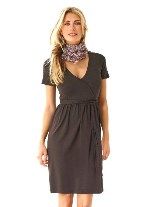 Ein femininer Allrounder für jede Gelegenheit. Attraktive Schnittführung mit tiefem V-Ausschnitt und Bindegürtel. Superelastisch und überaus praktisch - ideal für den Sommer. Länge ca. 94 cm. Trageangenehm und leicht aus 95% Viskose/5% Elasthan. Ohne abgebildeten Schal.