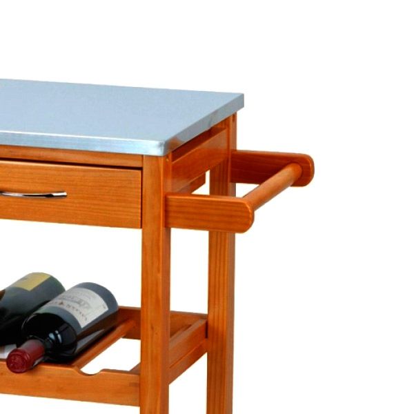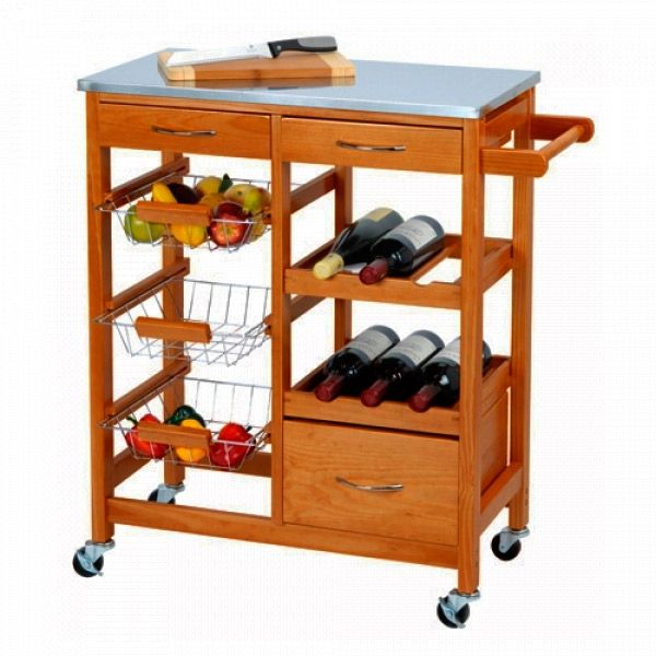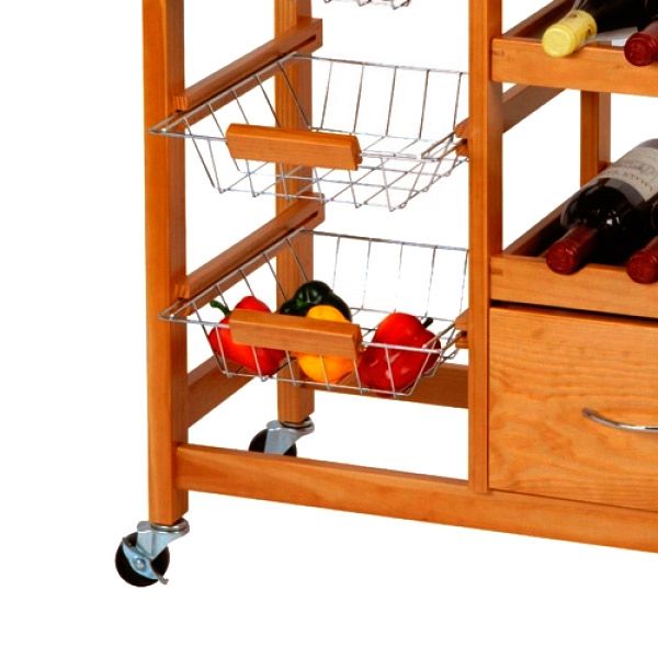 Dieser Küchenwagen aus Holz mit Rollen hat einen Griff, damit Sie ihn leicht hin- und herbewegen können und bietet jede Menge Stauraum, denn er verfügt über 3 Schubladen mit Griff, 3 Metallkörbe und 2 Flaschenregale. Außerdem ist die Oberfläche mit einer Edlestahlplatte bedeckt. Dieser Küchenwagen nimmt wenig Platz ein und ist leicht aufzubauen (Schrauben inklusive). Maße: ca. 66 x 84 x 36 cm.