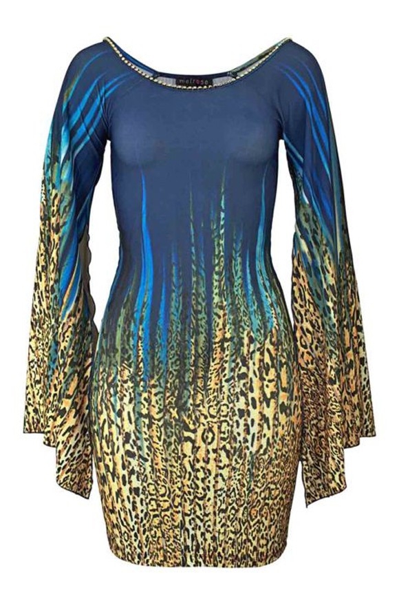 Extravagant und umwerfend in der Wirkung! Temperamentvoll designtes Kleid mit Allover-Print und hochgeschlitzten Trompetenärmeln. Entlang des Ausschnittes mit Strass-Steinen besetzt. Rückenlänge ca. 86 cm. Fließende Jersey-Stretch-Qualität aus 95% Polyester/5% Elasthan.