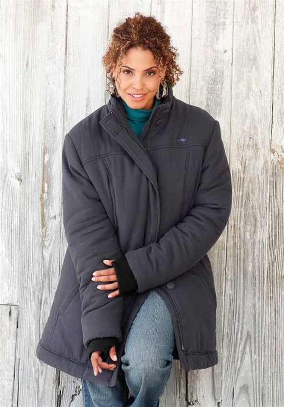 Sieht nicht nur super aus, sondern ist auch schön warm wattiert für kalte Tage! Hoch zu schließender Stehkragen mit abnehmbarer Kapuze. Große, aufgesetzte Taschen vorn. 2-Wege-Reißverschluß plus zusätzlicher Knopfleiste mit stoffbezogenen Knöpfen. Ärmelabschluß mit Rippenbündchen als Windschutz und Daumenlöchern. Kleine Logo-Stickerei auf der Brust. Gößenangepasste Länge von ca. 77 bis 86 cm, in steigenden Größen figurgünstig verlängert. Obermaterial aus 70% Baumwolle/30% Polyester. Futter und Wattierung aus 100% Polyester. Rippbündchen aus 89% Polyester/11% Elasthan.