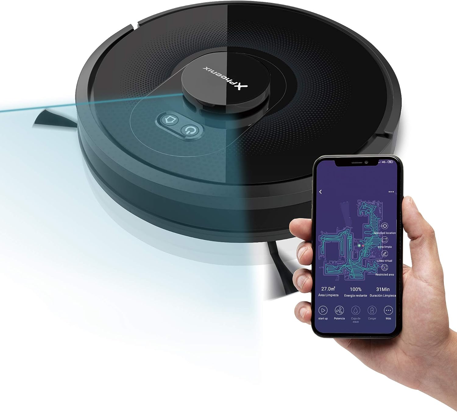 - Fegt, saugt, wischt und schrubbt den Boden