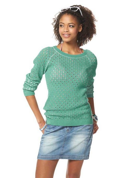 Sportiver Style mit Blickfang-Faktor. Lässig interpretierter, leicht transparenter Pullover von KangaROOS in aktueller Lochoptik. Aufwendig gefärbt mit ecrufarbenen Kontrast-Details. Legerer Raglanschnitt mit schräg angesetzten Ärmeln und tiefem Rundausschnitt. Rundum mit dauerhaft formbeständigen Bündchen aus elastischem Rippenstrick. Gesamtlänge ca. 64 cm. Hochwertige Strickqualität aus 100% Polyacryl.
