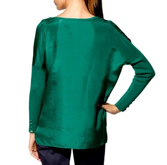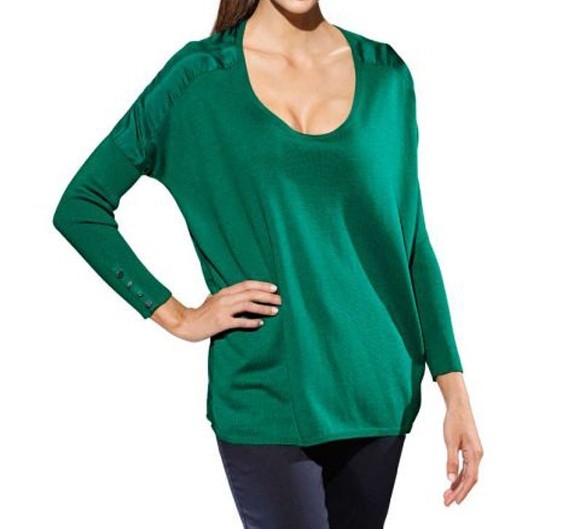 Unbeschwert spontan und lässig sportiv - attraktiver Style in toller Material-Kombi! Der Rücken und Schulterbereich sind mit matt glänzender Webware gearbeitet, Frontpartie und Ärmel aus softem Feinstrick. Langarm mit 4 Knöpfen. Feine Rippenstrickabschlüsse. Länge ca. 68 cm. Figurumspielende Form. Weicher Strick aus 60% Viskose/40% Baumwolle. Webware aus 100% Polyester.
