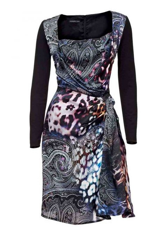 Leidenschaftlich inszeniertes Modell mit designstarken Detail-Upgrades. Wunderschön weiblich, der Carré-Ausschnitt mit Wasserfall. Der farbintensive Druck kommt auf der edel schimmernden Seide besonders gut zur Geltung. Figurschmeichelnde Faltendrapierung an Taille und Rock. Unifarbene Ärmel aus weichem Jersey. Vorder- und Rückteil apart bedruckt und aus reiner Seide. Hinten mit Reißverschluß. Figurbetonte Form. Länge ca. 94 cm. Obermaterial aus 100% Seide. Ärmel aus 95% Viskose/5% Elasthan. Futter aus 100% Acetat.