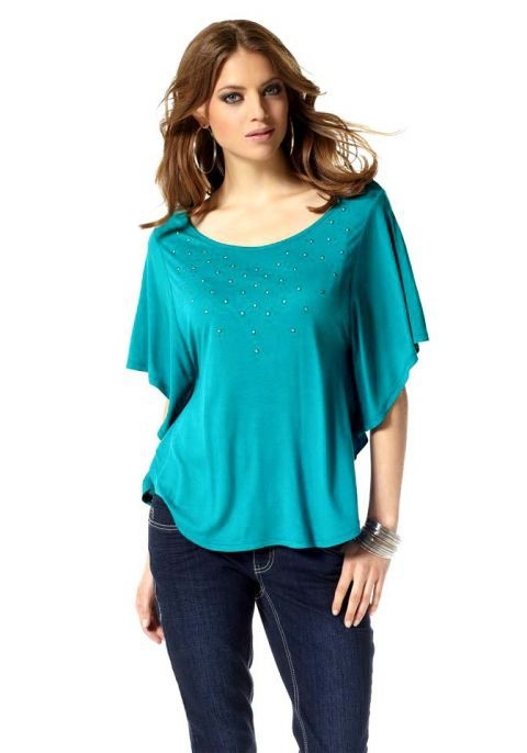 Bezaubernd feminines Shirt mit attraktiven, weiten Fledermausärmeln und stark abgerundetem Saumverlauf. Lässiger Sitz mit angeschnittenen Ärmeln und gesteppten Seitennähten. Vorn mit Nieten verziert. Länge ca. 64 cm. Figurumspielende Form. Weich fließender Single-Jersey aus 100% Viskose.