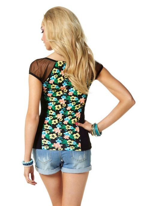 Kontraste, die begeistern. Außergewöhnlich designtes Shirt mit sommerlichem Print mit Hibiskusblüten und Kolibris.Leicht transparente Mesheinsätze auf den Schultern. Kleine Schleife und Spitze am Dekolleté. Länge ca. 64 cm. Uni- und bedruckte Ware in softweicher Qualität aus 95% Viskose/ 5% Elasthan. Meshware aus 100% Polyester.