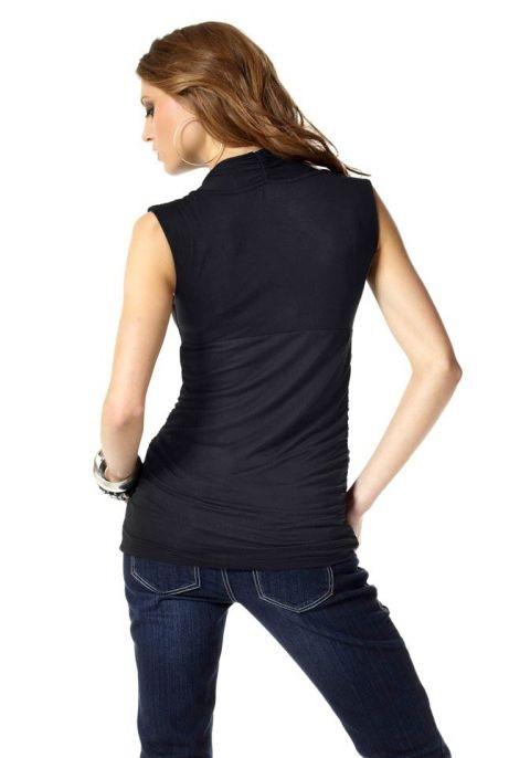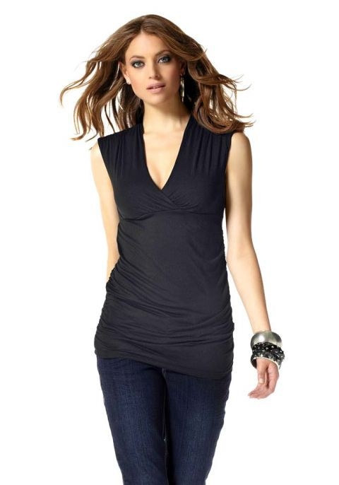 Ein Edel-Basic, das seine Trägerin modisch perfekt und äußerst feminin in Szene setzt. Ärmellose Longform. Tiefer V-Ausschnitt in Wickeloptik. Aufwendige Raffungen im Schulterbereich und hinten am Kragen. Ausgearbeitete Brustpartie. Ab der Unterbrustnaht mit modischen Raffungen seitlich. Figurbetonende Form. Länge ca. 72 cm. Softer Jersey aus 95% Viskose/5% Elasthan.