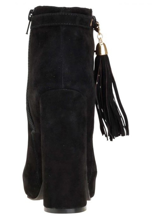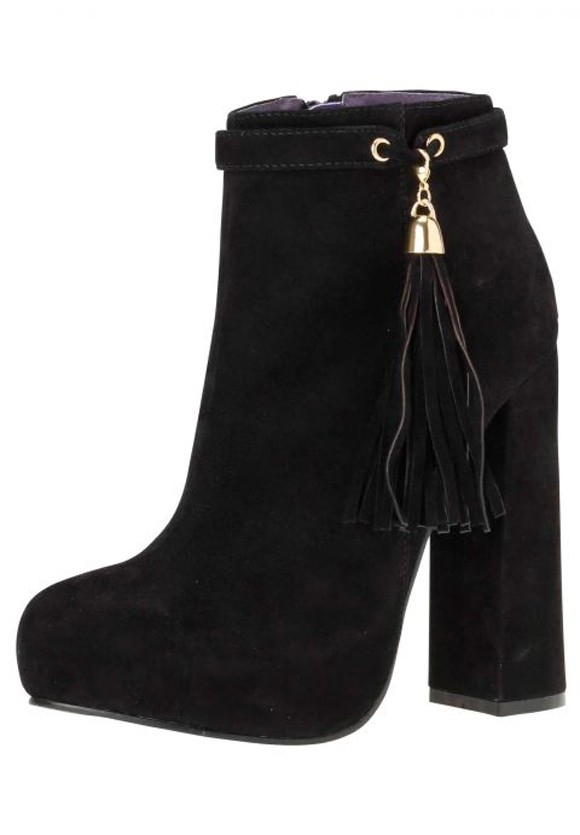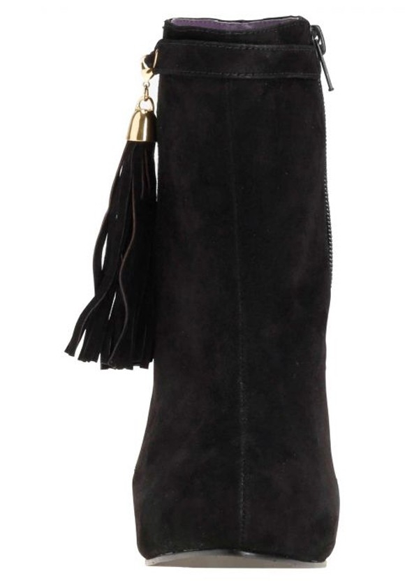 Ein Modemuß für Fashionistas. Stylishe Stiefelette mit Lederriemen am Schaftende und seitlich. Lederquaste mit silberfarbenem Accessoires zum Abnehmen. Obermaterial aus weichem Veloursleder. Lederfutter in der Kontrastfarbe Lila und gepolsterte Leder-Innensohle. Innenliegendes Plateau und Lederbezogener Absatz. Farblich passender Reißverschluß. Synthetik-Laufsohle. Bezogener Absatz, Höhe ca. 13 cm, Plateauhöhe ca. 2 cm. Enthält nichttextile Teile tierischen Ursprungs.