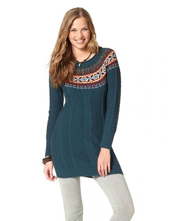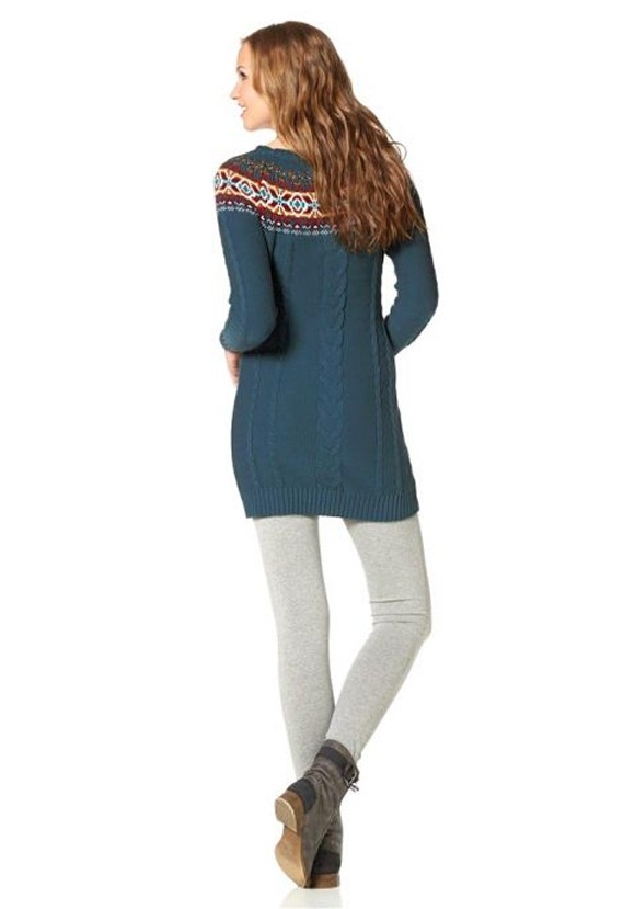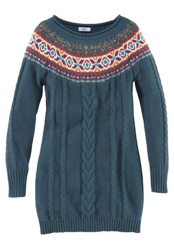 Eine aufregende Begegnung - zeitlos schöner Zopfmusterstrick zeigt sich innovativ mit raffiniert eingestricktem Norwegermuster. Rundhalsausschnitt mit Rollkante. Raglanärmel. Figurbetonende Form mit Rippenstrickabschlüssen. Länge ca. 84 cm. Wunderbar warmer Strick aus 50% Baumwolle/50% Polyacryl.