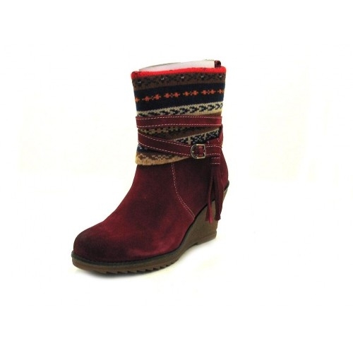 Rote Keilstiefelette mit Schaft im Norwegermuster. Als Bonmot wird