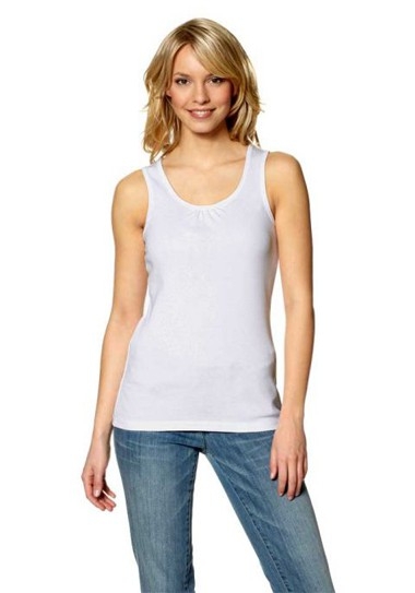 Ein tolles Duo im Doppelpack Für jede Gelegenheit der richtige Look. Ein weißes Top mit leichter Raffung am Ausschnitt. Ein Top mit effektvollem Frontdruck. Breitere Träger. Rippenblenden an Ausschnitt und Trägern. Figurbetonte Silhouette. Länge ca. 65 cm. Hochwertiger Jersey aus 100% Baumwolle.
