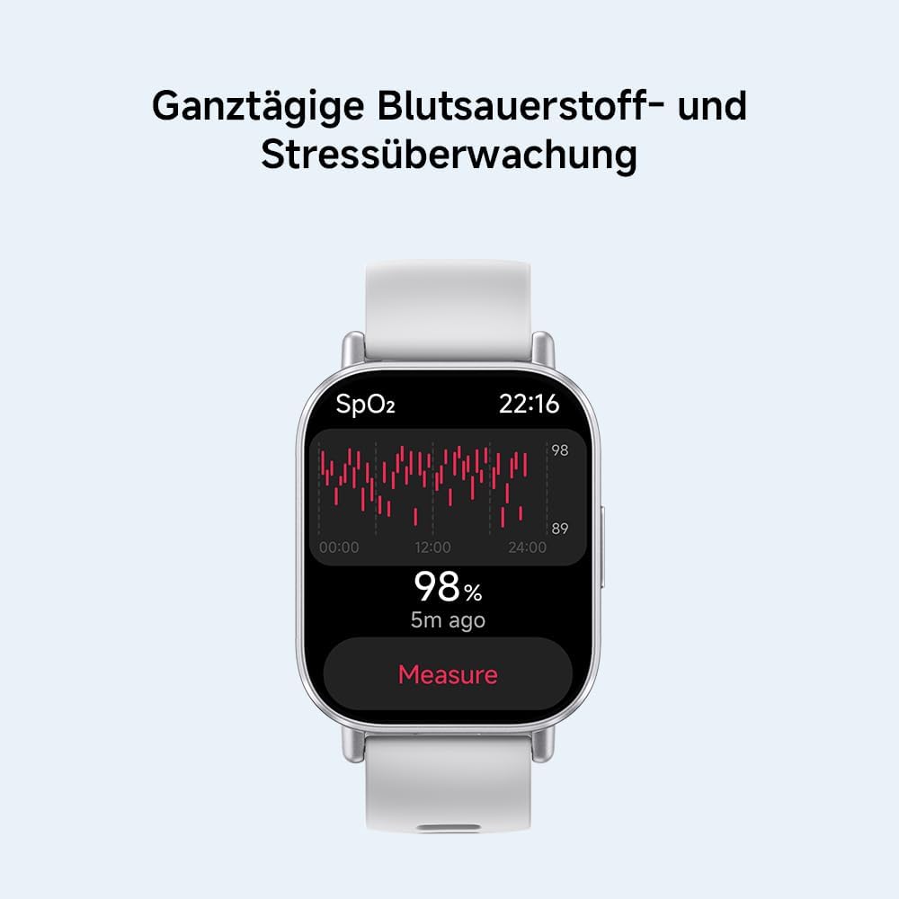 Auch Ihre Gesundheit bleibt im Blick: 24/7-Herzfrequenzmessung, Blutsauerstoff (SpO₂)-Sensor, Schlafüberwachung und Stress-Tracking helfen Ihnen, Ihr Wohlbefinden besser zu verstehen.