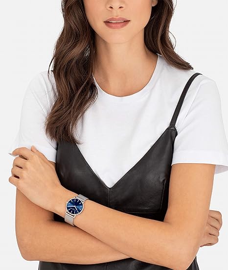 - Extra-flaches Gehäuse aus poliertem, silberfarbenen Edelstahl, 34 mm, Gehäusehöhe 7 mm, kratzunempfindliches Mineralglas. Auf dem blauen Zifferblatt sorgen silberfarbene stundenindexe für optimale Ablesbarkeit